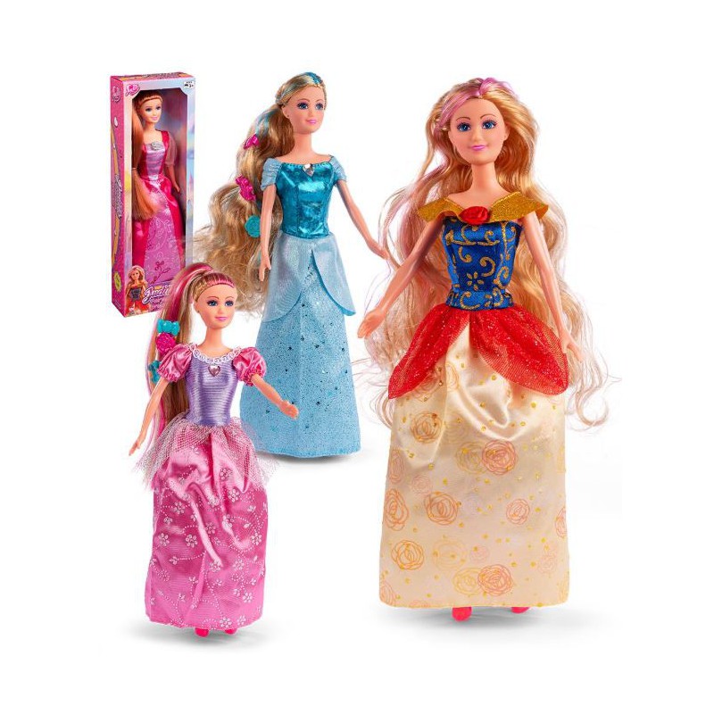 Eventyrprinsesse dukke i smukt og farverigt design, der indbyder til fantasifuld leg. Dukken er klædt i en elegant kjole med fine detaljer og glitrende elementer, som giver et ægte prinsesseudtryk. Det lange hår kan redes og styles, hvilket gør legen endnu mere kreativ og varieret.