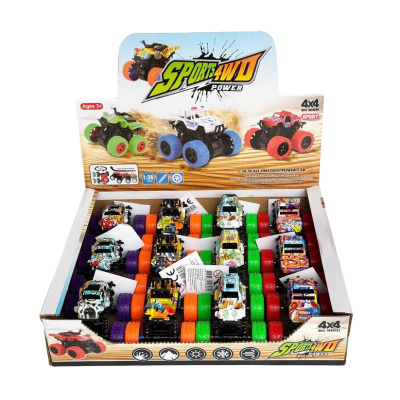Farverig terrængående legetøjsbil med stort mønstrede gummihjul og blå fælge.