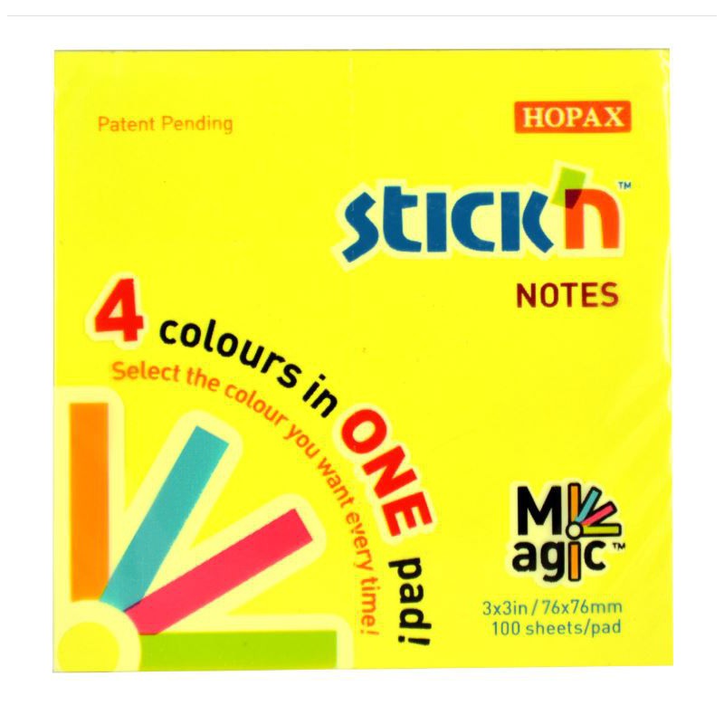 Selvklæbende Stick Notes i skiftende lag forskellige neonfarger. Magic-serien gør, at du nemt kan scrolle ned til den farve, du ønsker, så du ikke skal tage det øverste ark, som du skal på almindelige Stick Notes. 100 ark, 76x76mm. 4 farver.