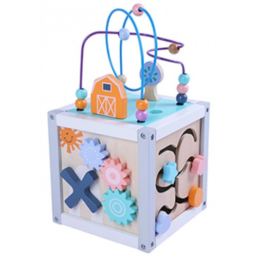Aktivitetskube i træ. Med forskellige funktioner på siderne og låg med kuglelabyrint.