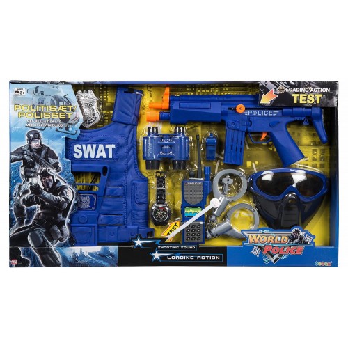 Mega politisæt. Med maskinpistol med træk tilbage-funktion, mobiltelefon med lyde, skudsikker vest og masser af tilbehør. Inkl. 3 stk. knapcellebatterier.