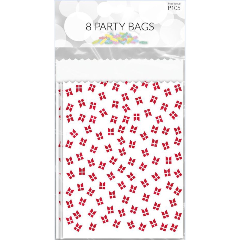 Pakke med 8 slikposer dekoreret med danske flag. Perfekte til fødselsdage og fester, hvor der skal deles godter ud med et festligt tema.