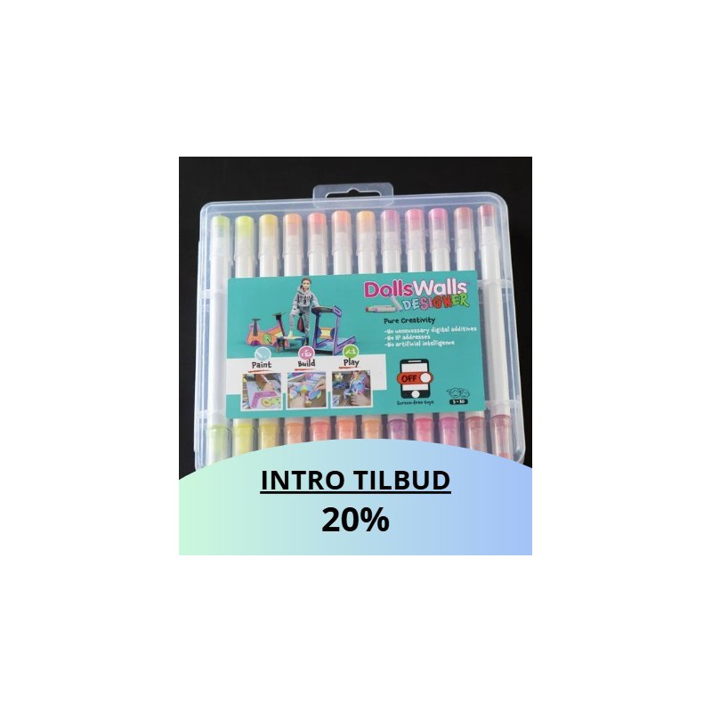 Slip fantasien løs med denne pakke fyldt med 24 supergode tusser i spændende farver! Her får du alle de nuancer, du skal bruge til at gøre dine DollsWalls møbler og rum helt unikke.