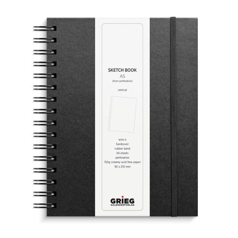 Mayland. Skitseblok med hårdt spiralbundet kunstskindsomslag og elastik. Indeholder cremefarvet syrefrit papir, 50 ulinjerede sider på 150 g papir. Papirformat efter perforering: A5