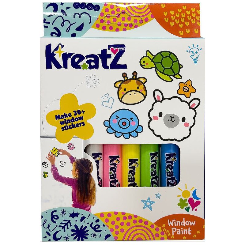 Slip kreativiteten løs med *KreatZ Window Paint*, et farverigt sæt hvor børn kan lave deres egne vinduesklistermærker. Sættet indeholder flere klare farver og sjove motiver, som gør det let at skabe over 30 unikke designs. Perfekt til børn fra 3 år, der elsker at tegne, dekorere og udforske deres fantasi. Farverne påføres skabelonerne, tørres og kan derefter sættes direkte på vinduerne for en legende og personlig udsmykning. En hyggelig og kreativ aktivitet til både hverdag og weekend.