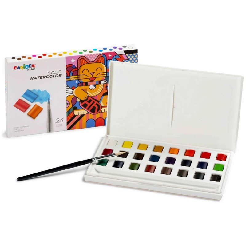 Carioca Plus vandfarvesæt med 24 farvetabletter i praktisk æske. De klare farver er nemme at blande og perfekte til kreative projekter, skoleopgaver og hobbyaktiviteter for både børn og voksne.