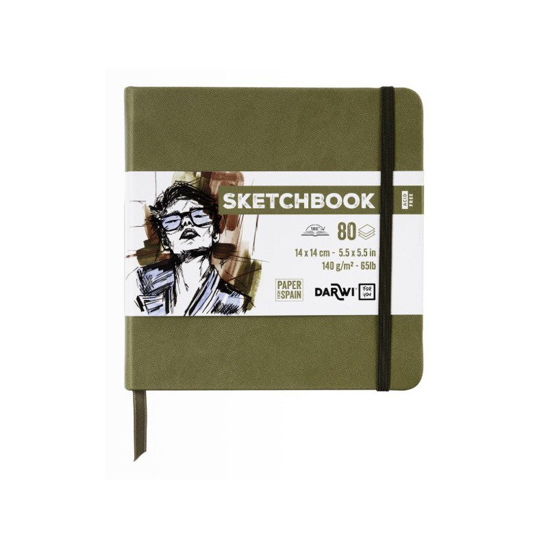 Skitsebog 14x14 med 80 ark 140g papir i khaki. Perfekt til tegning og kreative idéer.