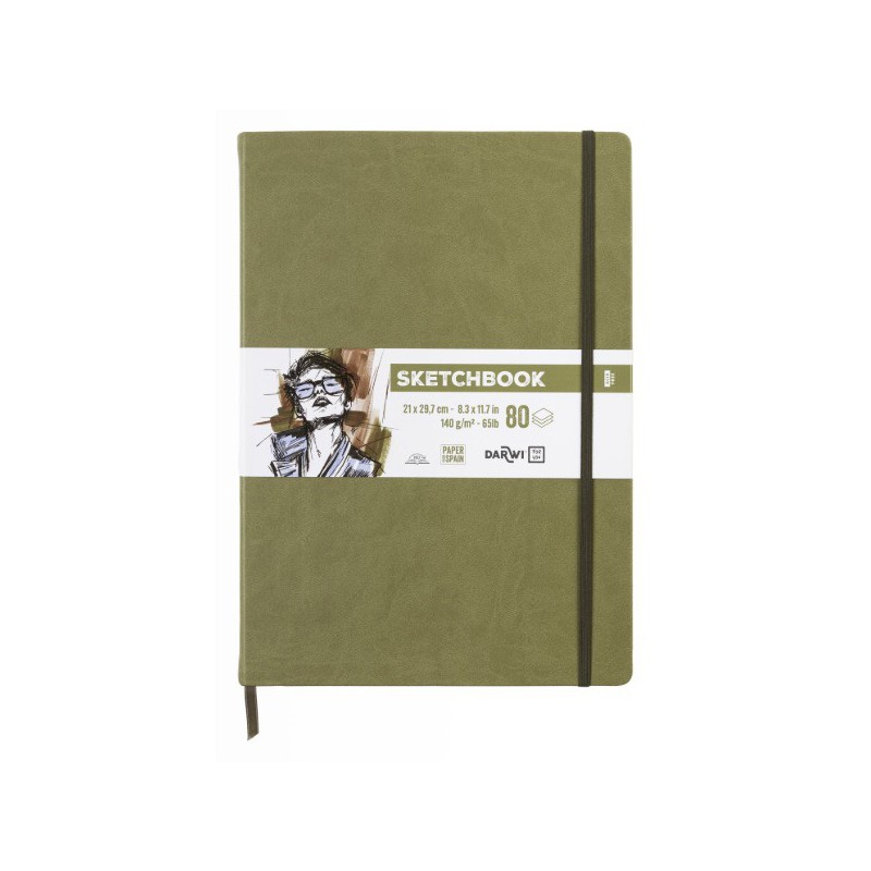 Skitsebog A4 med 80 ark 140g papir i khaki. Perfekt til tegning og kreative idéer.