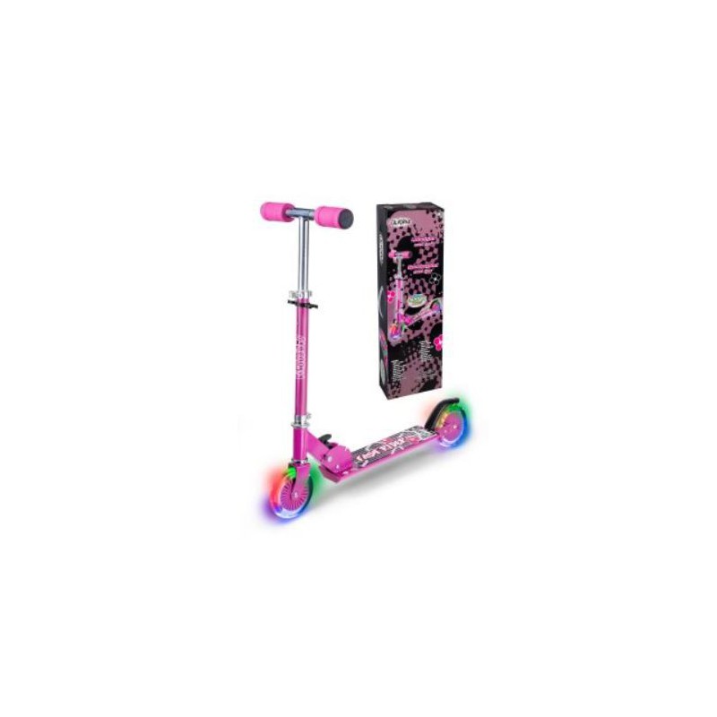Pink løbehjul med LED-lys i hjulene. Specifikationer: Hjulene lyser, når du kører 120x22 mm hjul ABEC 5 kuglelejer Slide lock-foldemekanisme Justerbart styr fra 68-79 cm Håndtag i EVA-skum Bagbremse Kan bære 50 kg
