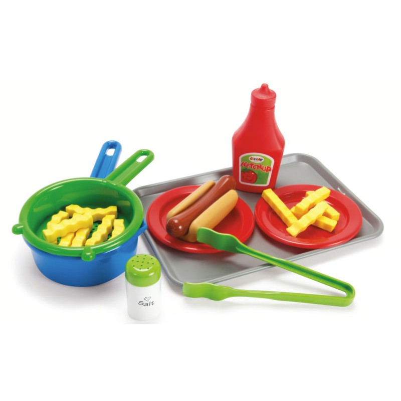 Sættet indeholder alt, hvad små kokke behøver for at servere lækre hotdogs: pølser, brød, tilbehør, samt praktiske skåle og redskaber i forskellige farver som rød, blå og grøn.