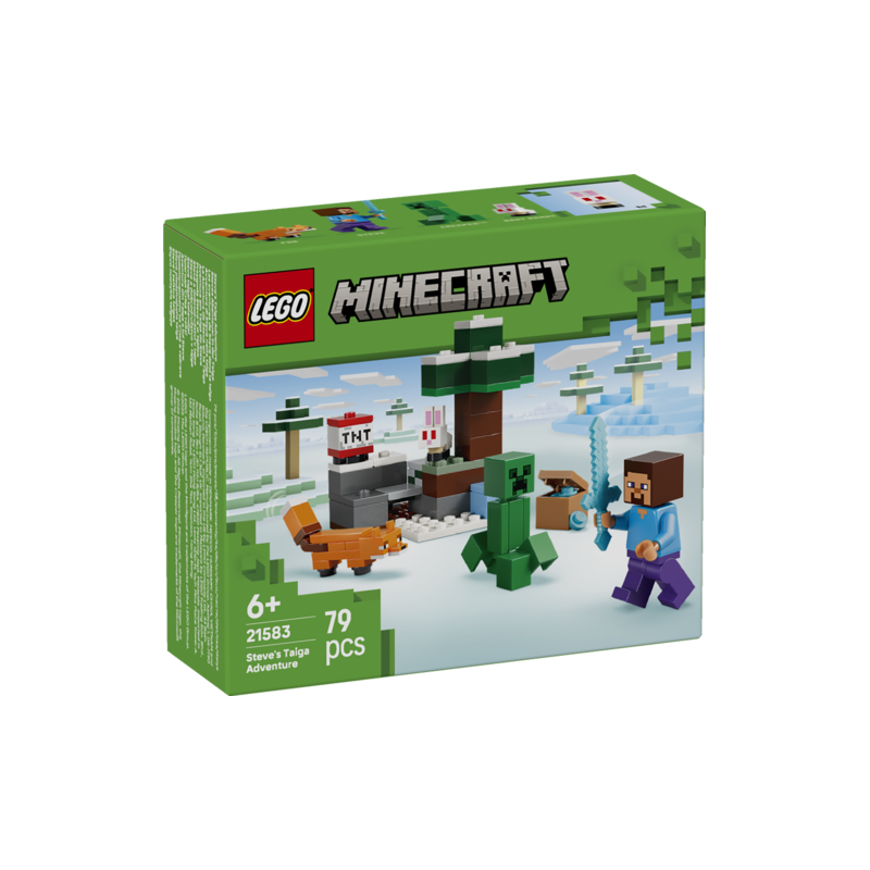 Byg eventyr i tajga-biomet med en minifigur af Steve, plus en figur af en Creeper™ og 2 Minecraft-dyrefigurer: en ræv og en kaninunge
