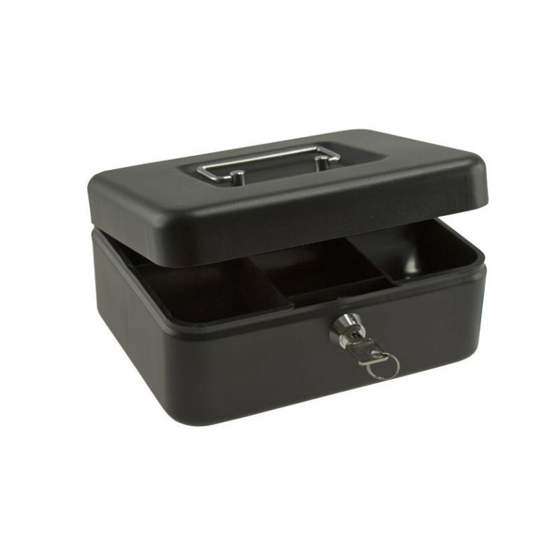 Sort pengekasse i formstøbt stål med håndtag og møntbakke i plast med 6 rum.