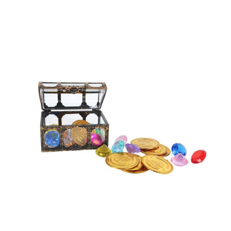 Lille skattekiste på 7,5 cm fyldt med 24 miksede guld- og diamantdele. Perfekt til leg og skattejagt for børn.