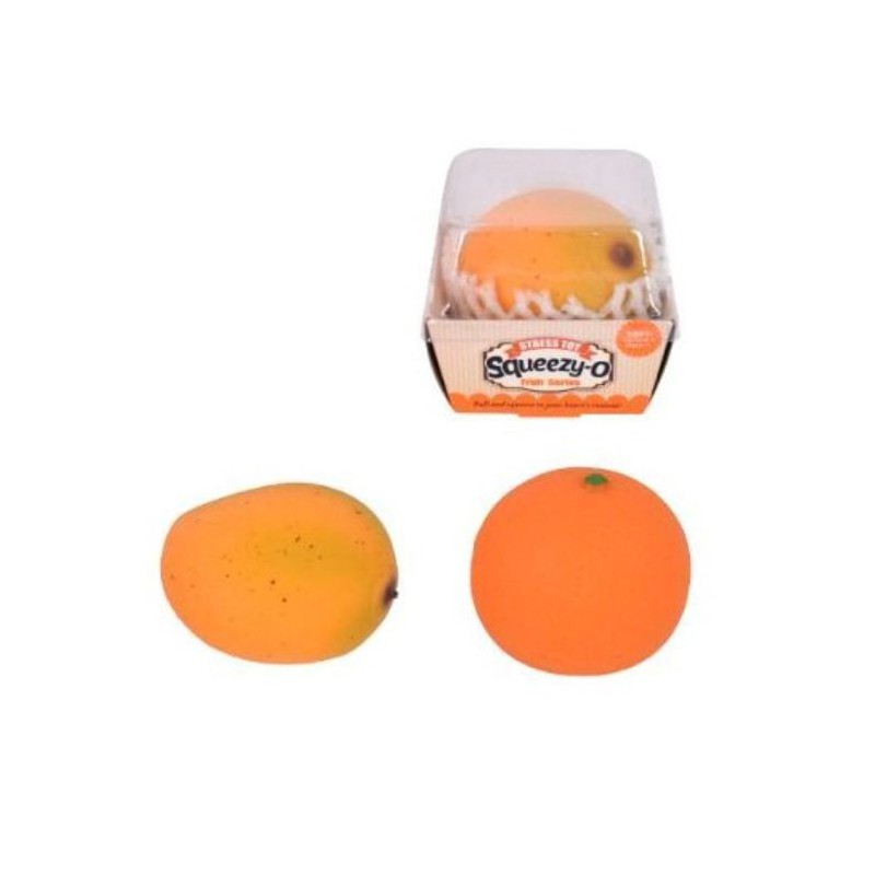 Blød klemmefrugt på 6 cm formet som mango eller appelsin. Perfekt som fidget-legetøj til afslappende og sanselig leg.