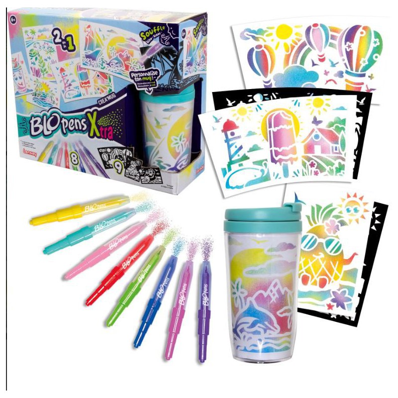 Med BLOpens Xtra krea kop kan du lave dine helt egne designs ved hjælp af de smarte spraypenne og sjove skabeloner.