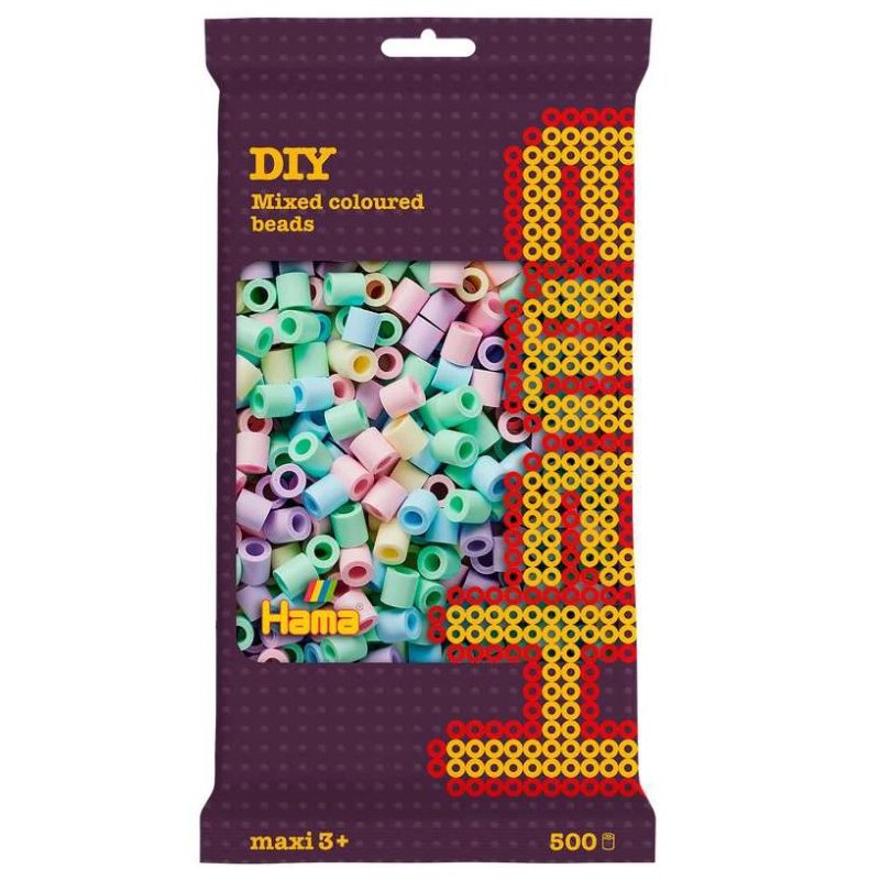 Pose med ca. 500stk. maxi perler i mix af pastel farver nr. 2, 95, 96 ,97 og 98. Ophængsposen måler 24 x 13 x 4cm.