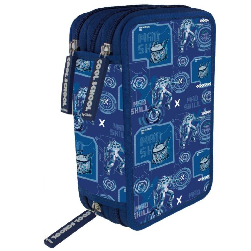Tinka penalhus med cyber robot-design og tre rum. God plads til blyanter, tuscher og skolegrej – praktisk og sejt til skoledagen.