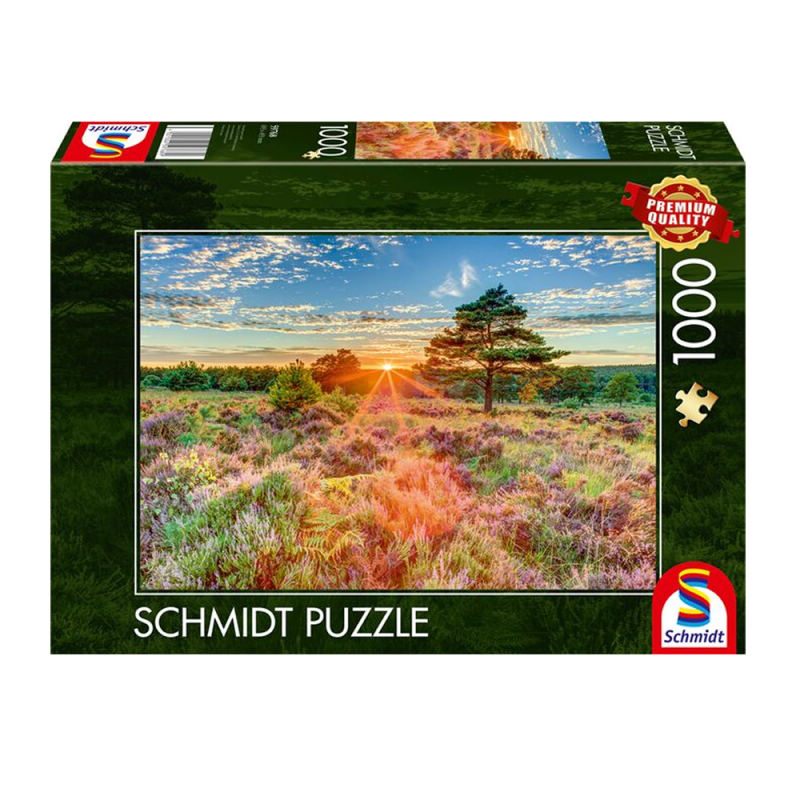 Indeholder et 1000-brikkers puslespil af en smuk solnedgang over heden.