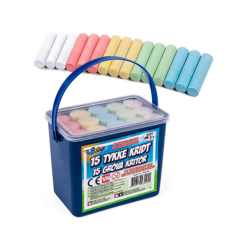 Farvede tykkridt i praktisk sæt med 15 stk., ideelt til kreativ leg og tegning for børn. Kridtene har en kraftig og solid form, som gør dem nemme at holde om – også for mindre hænder. De giver klare og levende farver, der gør det sjovt at tegne på både papir og andre egnede overflader.