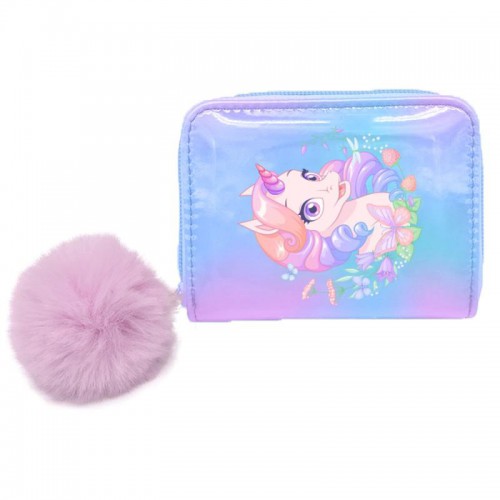 Fin pung fra Tinka med enhjørningmotiv på og en lille pompom. Der er plads til mønter, sedler og kort i pungen.