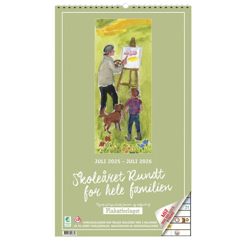 Smuk håndtegnet familiekalender som følger skoleåret med 12 ark på 29 x 48 cm, med en måned på hvert ark.