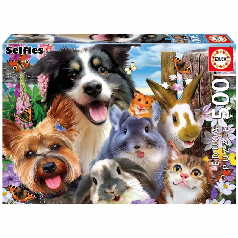 Et charmerende 500-brikkers puslespil fyldt med smilende kæledyr, farverige blomster og sommerfugle – perfekt til hyggelige stunder for hele familien.