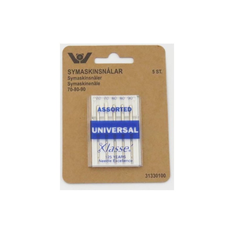 Universelle symaskinenåle str. 70–90 i høj kvalitet. Velegnet til de fleste husholdningsmaskiner og almindelige stoffer. 5 stk.