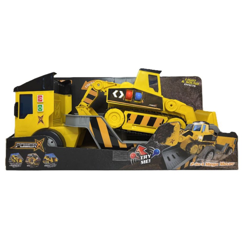 Power X Mega Mover 2‑i‑1 er et actionfyldt arbejdskøretøj, der kombinerer lastbil og gravemaskine i ét motordrevet legetøj. Børn kan transportere gravemaskinen på ladet, læsse den af og straks gå i gang med gravearbejdet ved hjælp af de kraftige grabber. Lys- og lydeffekterne giver ekstra realisme og gør legen endnu mere levende. Sættet leveres komplet med både AG13- og AA‑batterier, så legen kan begynde med det samme. Perfekt til små entreprenører fra 3 år, der elsker byggeplads‑eventyr og fantasifuld rolleleg.