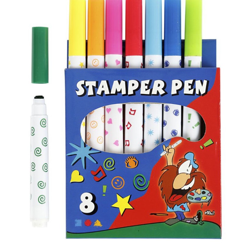 Vandbaserede tusch med 8 forskellige stempelmotiver i hver sin farve