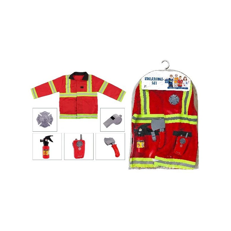 Sættet består af rød brandmandsjakke med reflekser, fløjte, brandslukker, økse, walkie talkie samt skilt.